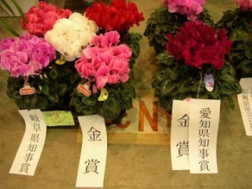 | 品評会に出展されるシクラメンはどれも素晴らしい品物ばかりで、プロの目から見てもその優劣の判定は難しく、審査の基準もかなり細かなところまでチェックされます。 |
